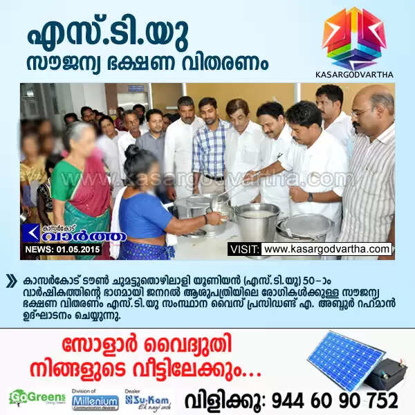 (www.kasargodvartha.com 01/05/2015) കാസര്കോട് ടൗണ് ചുമട്ടുതൊഴിലാളി യൂണിയന് (എസ്.ടി.യു) 50-ാം വാര്ഷികത്തിന്റെ ഭാഗമായി ജനറല് ആശുപത്രിയിലെ രോഗികള്ക്കുള്ള സൗജന്യ ഭക്ഷണ വിതരണം എസ്.ടി.യു സംസ്ഥാന വൈസ് പ്രസിഡണ്ട് എ. അബ്ദുര് റഹ് മാന് ഉദ്ഘാടനം ചെയ്യുന്നു.