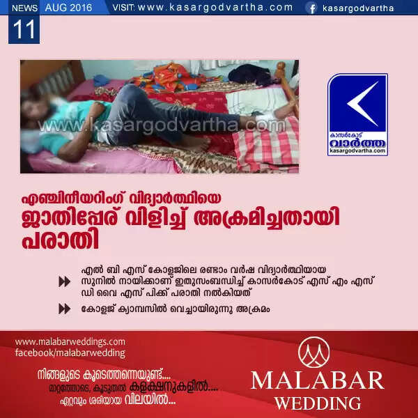 കാസര്കോട്: (www.kasargodvartha.com 11/08/2016) എഞ്ചിനീയറിംഗ് കോളജ് വിദ്യാര്ത്ഥിയെ സഹപാഠികള് ജാതിപ്പേര് വിളിച്ച് അക്രമിച്ചതായി പരാതി. എല് ബി എസ് കോളജിലെ രണ്ടാം വര്ഷ വിദ്യാര്ത്ഥിയായ സുനില് നായിക്കാണ് (21) ഇതുസംബന്ധിച്ച് കാസര്കോട് എസ് എം എസ് ഡി വൈ എസ് പിക്ക് പരാതി നല്കിയത്. പരിക്കേറ്റ സുനില് ആശുപത്രിയില് ചികിത്സ തേടി.