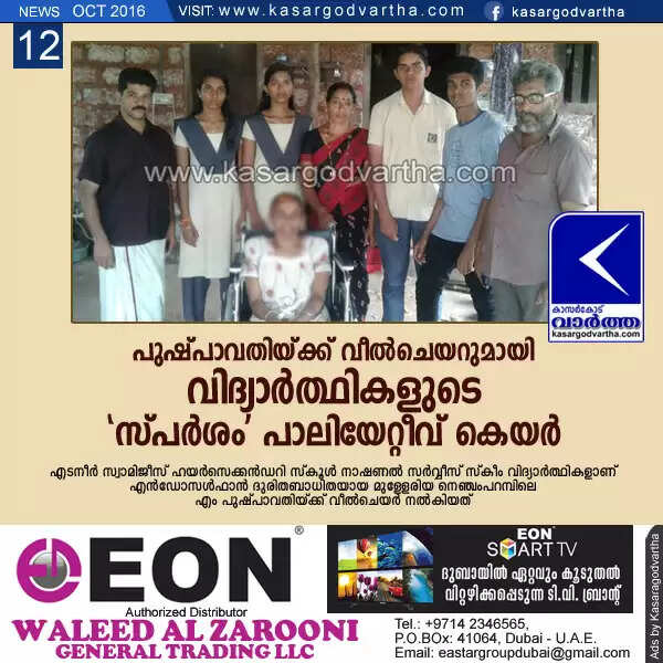 Keywords: Kasaragod, Edneer, Students, Paliative-care-society, Sparsham, Wheel chair, Donated, Pushpavathi, Polio, NSS, Friends, Moideen Poovadukka.