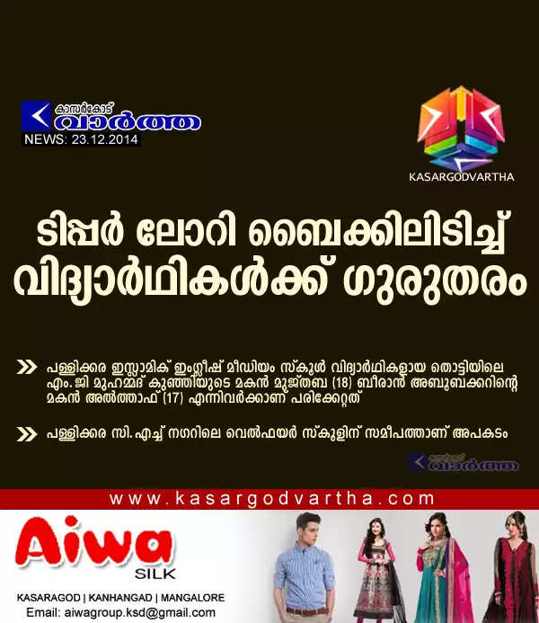 ഉദുമ: (www.kasargodvartha.com 23.12.2014) ടിപ്പര്‍ ലോറി ബൈക്കിലിടിച്ച് വിദ്യാര്‍ത്ഥികള്‍ക്ക് ഗുരുതരമായി പരിക്കേറ്റു. പള്ളിക്കര ഇസ്ലാമിക് ഇംഗ്ലീഷ് മീഡിയം സ്‌കൂള്‍ വിദ്യാര്‍ഥികളായ തൊട്ടിയിലെ എം.ജി മുഹമ്മദ് കുഞ്ഞിയുടെ മകന്‍ മുജ്തബ (18) ബീരാന്‍ അബൂബക്കറിന്റെ മകന്‍ അല്‍ത്താഫ് (17) എന്നിവര്‍ക്കാണ് പരിക്കേറ്റത്. ഇവരെ മംഗളൂരുവിലെ ആശുപത്രിയിലേക്ക് മാറ്റി.