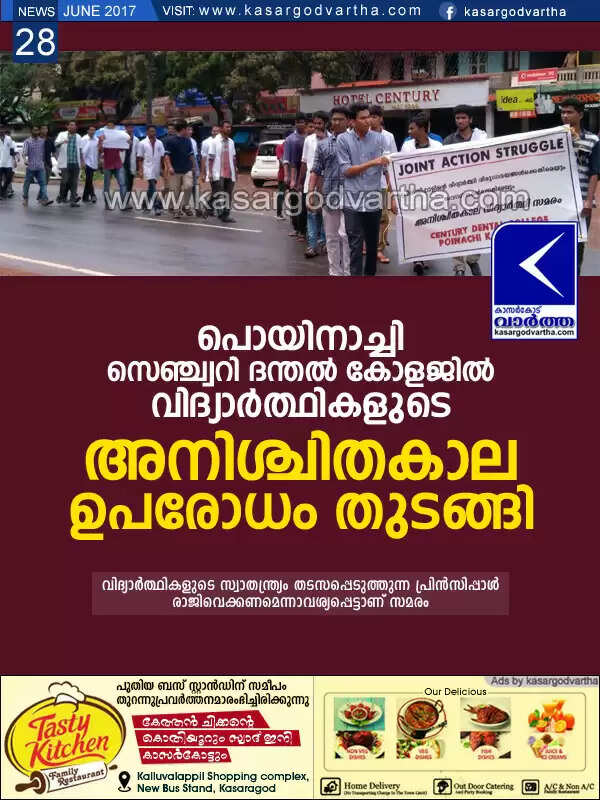 ഉദുമ: (www.kasargodvartha.com 28.06.2017) പൊയിനാച്ചി സെഞ്ച്വറി ദന്തല്‍ കോളജിലെ പ്രിന്‍സിപ്പലിനെ പുറത്താക്കണമെന്നാവശ്യപ്പെട്ട് വിദ്യാര്‍ത്ഥികളുടെ അനിശ്ചിതകാല ഉപരോധം തുടങ്ങി. പ്രിന്‍സിപ്പള്‍ വിദ്യാര്‍ത്ഥികളുടെ സ്വാതന്ത്ര്യം തടസപ്പെടുത്തുന്നതിനും വിദ്യാര്‍ത്ഥിനികളോട് മോശമായി പെരുമാറുന്നതിനുമെതിരെയുമാണ് വിദ്യാര്‍ത്ഥികളുടെ ഉപരോധം.