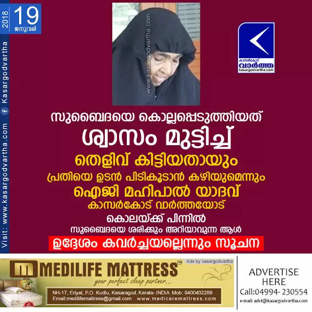 സുബൈദയെ കൊല്ലപ്പെടുത്തിയത് ശ്വാസം മുട്ടിച്ച്; തെളിവ് കിട്ടിയതായും പ്രതിയെ ഉടന് പിടികൂടാന് കഴിയുമെന്നും ഐജി മഹിപാല് യാദവ് കാസര്കോട് വാര്ത്തയോട്; കൊലയ്ക്ക് പിന്നില് സുബൈദയെ ശരിക്കും അറിയാവുന്ന ആള്, ഉദ്ദേശം കവര്ച്ചയല്ലെന്നും സൂചന