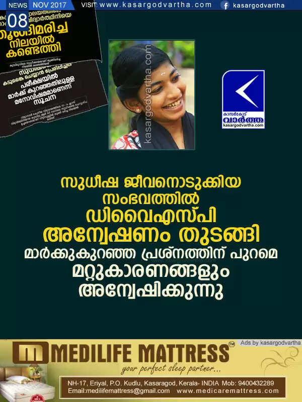 സുധീഷ ജീവനൊടുക്കിയ സംഭവത്തില്‍ ഡി വൈ എസ് പി അന്വേഷണം തുടങ്ങി; മാര്‍ക്കുകുറഞ്ഞ പ്രശ്നത്തിന് പുറമെ മറ്റുകാരണങ്ങളും അന്വേഷിക്കുന്നു