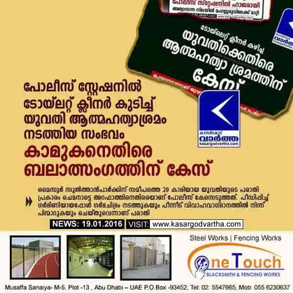 പോലീസ് സ്റ്റേഷനില് ടോയ്ലറ്റ് ക്ലീനര് കുടിച്ച് യുവതി ആത്മഹത്യാശ്രമം നടത്തിയ സംഭവം; കാമുകനെതിരെ ബലാത്സംഗത്തിന് കേസ്