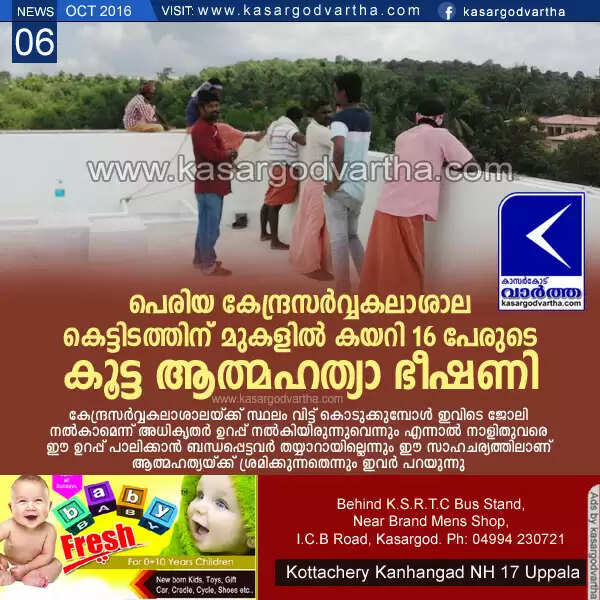 പെരിയ കേന്ദ്രസര്വ്വകലാശാല കെട്ടിടത്തിന് മുകളില് കയറി 16 പേരുടെ കൂട്ട ആത്മഹത്യാ ഭീഷണി