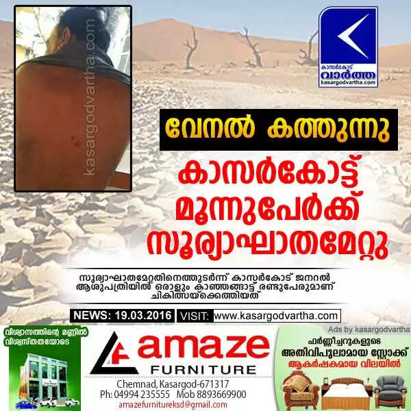 വേനല് കത്തുന്നു; കാസര്കോട്ട് മൂന്നുപേര്ക്ക് സൂര്യാഘാതമേറ്റു