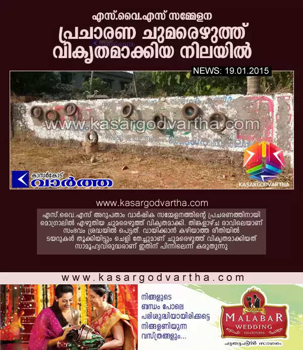 മൊഗ്രാല്‍: (www.kasargodvartha.com 19/01/2015) എസ്.വൈ.എസ് അറുപതാം വാര്‍ഷിക സമ്മേളനത്തിന്റെ പ്രചരണത്തിനായി മൊഗ്രാലില്‍ എഴുതിയ ചുമരെഴുത്ത് വികൃതമാക്കി. തിങ്കളാഴ്ച രാവിലെയാണ് സംഭവം ശ്രദ്ധയില്‍ പെട്ടത്. വായിക്കാന്‍ കഴിയാത്ത രീതിയില്‍ ടയറുകള്‍ തൂക്കിയിട്ടും ചെളി തേച്ചുമാണ് ചുമരെഴുത്ത് വികൃതമാക്കിയത്.