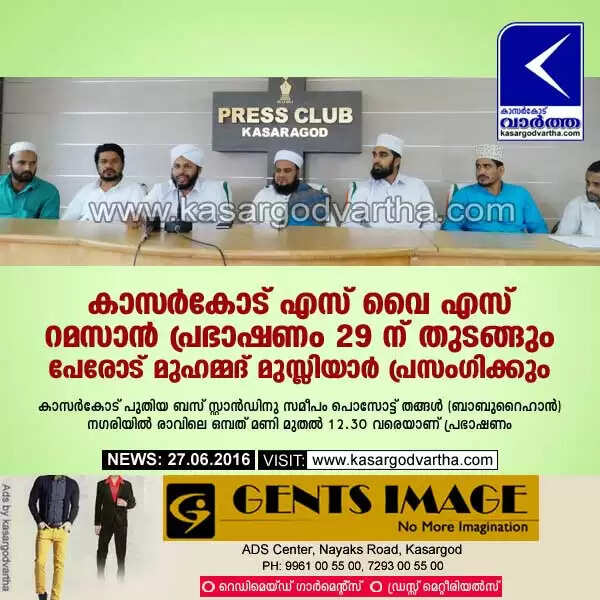 കാസര്‍കോട്: (www.kasargodvartha.com 27/06/2016) എസ്.വൈ.എസ് ജില്ലയിലെ 30 കേന്ദ്രങ്ങളില്‍ വിശുദ്ധ റമസാനില്‍ സംഘടിപ്പിച്ചു വരുന്ന റമസാന്‍ പ്രഭാഷണ പരമ്പരയ്ക്ക് സമാപം കുറിച്ച് ഈ മാസം 29, 30 തിയ്യതികളില്‍ കാസര്‍കോട് പുതിയ  ബസ് സ്റ്റാന്‍ഡിനു സമീപം പൊസോട്ട് തങ്ങള്‍ (ബാബുറൈഹാന്‍) നഗരിയില്‍ റമസാന്‍ പ്രഭാഷണം നടക്കുമെന്ന് ഭാരവാഹികള്‍ വാര്‍ത്താസമ്മേളനത്തില്‍ അറിയിച്ചു.