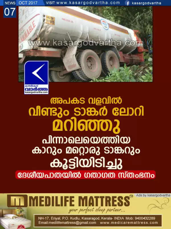 Keywords:  Kerala, Cherkala, news, Car, Tanker-Lorry, National highway, Bevinja, Tanker lorry accident; Traffic interrupted.