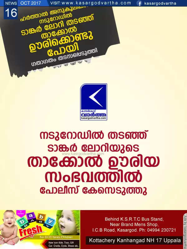Keywords: Kasaragod, Kerala, news, Police, case, Tanker-Lorry, Tanker lorry blocked in Middle of the road; police case registered