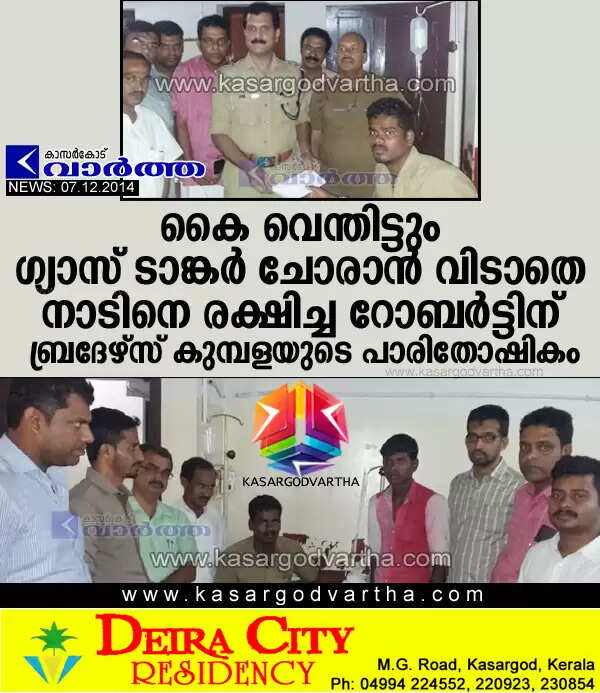 റോബര്ട്ടിന് ആശുപത്രിയിലെത്തി പാരിതോഷികം സമ്മാനിച്ച ചടങ്ങില് ബ്രദേഴ്സ് കുമ്പള ഭാരവാഹികളായ അസീസ് കളത്തൂര്, കെ.വി. യൂസുഫ്, സത്താര് ആരിക്കാടി, അബ്ബാസ് അലി, നാഗേഷ് കര്ള, എം.പി. ഖാലിദ്, അഷ്റഫ് കര്ള, സിദ്ദീഖ് ദണ്ഡഗോളി തുടങ്ങിയവര് സംബന്ധിച്ചു.