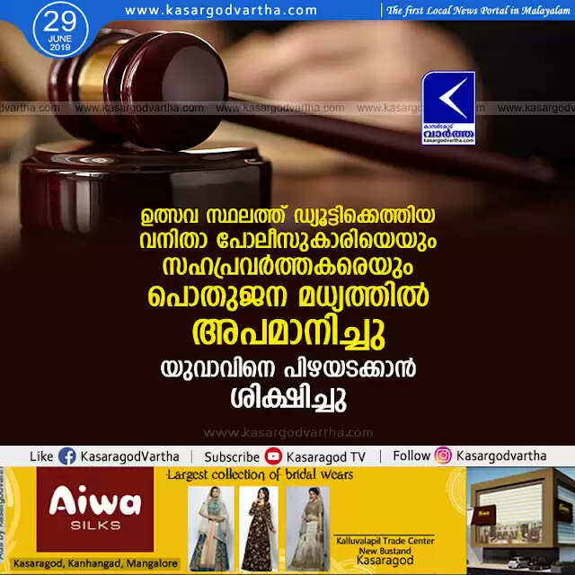 ഉത്സവ സ്ഥലത്ത് ഡ്യൂട്ടിക്കെത്തിയ വനിതാ പോലീസുകാരിയെയും സഹപ്രവര്ത്തകരെയും പൊതുജന മധ്യത്തില് അപമാനിച്ചു; യുവാവിനെ പിഴയടക്കാന് ശിക്ഷിച്ചു