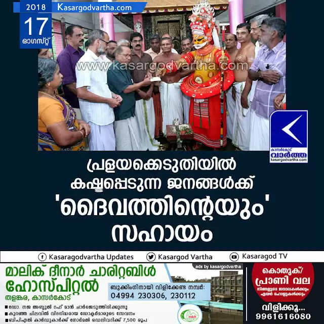കാസര്കോട്: (www.kasargodvartha.com 17.08.2018) പ്രളയക്കെടുതിയില് കഷ്ടപ്പെടുന്ന ജനങ്ങള്ക്ക് 'ദൈവത്തിന്റെയും' സഹായം കിട്ടുകയെന്നത് വലിയ സന്ദേശമാണ് സമൂഹത്തിന് നല്കുക. കഷ്ടപ്പാട് വരുമ്പോള് നമ്മളെല്ലാം പറയുന്ന കാര്യമാണ് ദൈവം തുണയെന്നത്. അത്തരമൊരു തുണയാണ് പിലിക്കോട് എന്ന നാട്ടില് നിന്നും ഉണ്ടായിട്ടുള്ളത്. കേരളം പ്രളയക്കെടുതിയില്പ്പെട്ട് ഉഴലുമ്പോള് നാട് ഒന്നാകെ സഹായത്തിന് ഇറങ്ങി തിരിച്ചിരിക്കുമ്പോഴാണ് 'ദൈവത്തിന്റെ സഹായവും' ദുരിതമനുഭവിക്കുന്നവര്ക്ക് കിട്ടിയിരിക്കുന്നത്.