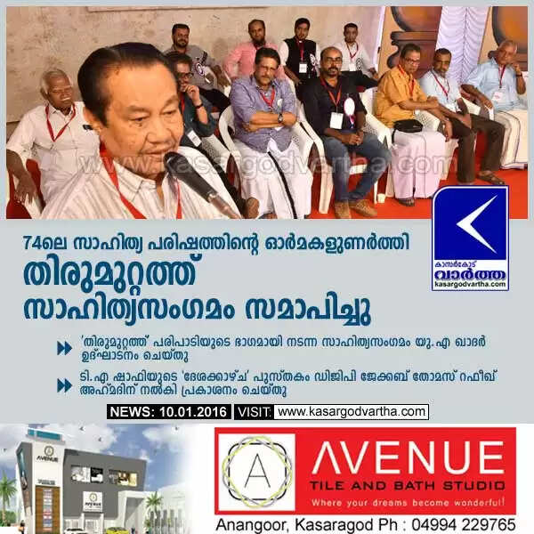 സാഹിത്യസംഗമം സമാപനം റഫീഖ് അഹ്മദ് ഉദ്ഘാടനം ചെയ്തു. ടി.എ ഷാഫിയുടെ 'ദേശക്കാഴ്ച' പുസ്തകം ഡിജിപി ജേക്കബ് തോമസ് റഫീഖ് അഹ് മദിന് നല്കി പ്രകാശനം ചെയ്തു. പി.വി കൃഷ്ണന് അധ്യക്ഷനായി. മുരുകന് കാട്ടാക്കട, ഫൈസല് എളേറ്റില്, ടി.എ ഷാഫി, നൗഫല് തളങ്കര എന്നിവര് സംസാരിച്ചു. കെ ഷുഹൈബ് സ്വാഗതവും ഇബ്രാഹിം നന്ദിയും പറഞ്ഞു.