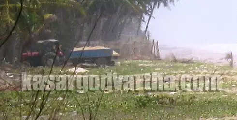 കടല്‍ക്കരയില്‍ നിന്നും മണല്‍ കുഴിച്ചെടുത്ത് വാഹനത്തില്‍ നിറയ്ക്കുന്നു