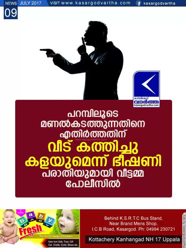 പറമ്പിലൂടെ മണല്‍കടത്തുന്നതിനെ എതിര്‍ത്തതിന് വീട് കത്തിച്ചു കളയുമെന്ന് ഭീഷണി; പരാതിയുമായി വീട്ടമ്മ പോലീസില്‍
