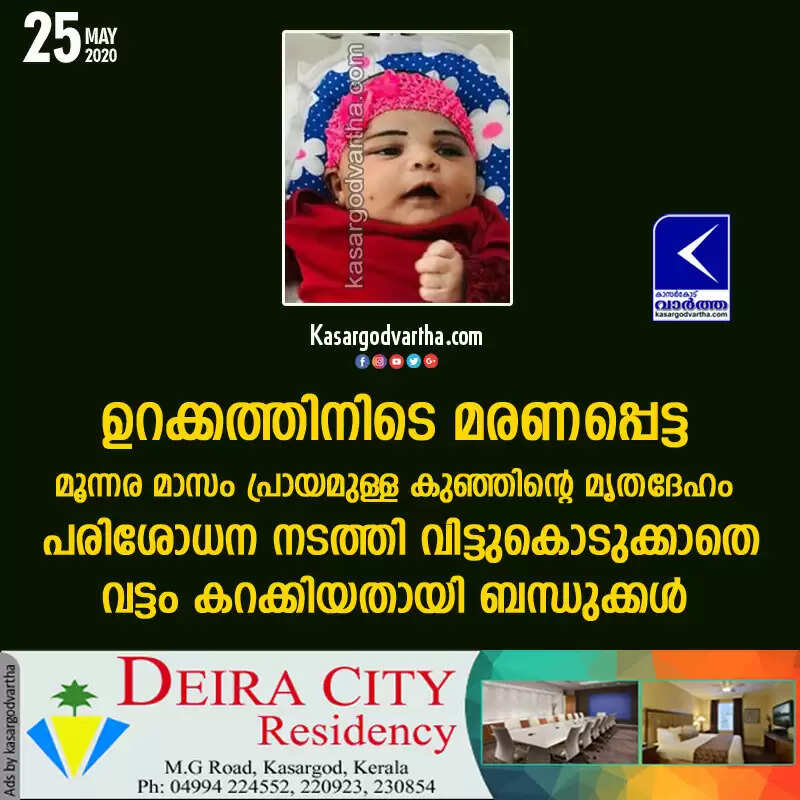 Keywords: Kasaragod, Kerala, News, Baby, Death, Dead body, Chawki, three and half month old infant who died during sleep