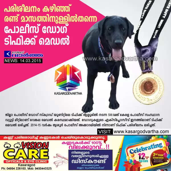 പരിശീലനം കഴിഞ്ഞ് രണ്ട് മാസത്തിനുള്ളില്തന്നെ പോലീസ് ഡോഗ് ടിഫിക്ക് മെഡല്