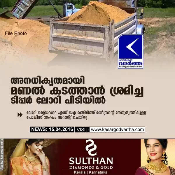 Keywords : Kasaragod, Tipper Lorry, Arrest, Driver, Chemanad, Group, Police, Illegally, Sand, SI, Tipper lorry seized for illegal sand trafficking