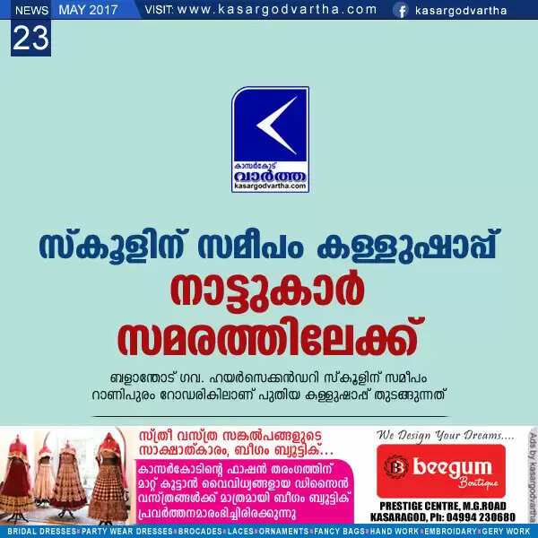 കാഞ്ഞങ്ങാട്: (www.kasargodvartha.com 23.05.2017) സ്കൂളിന് സമീപം കള്ളുഷാപ്പ് തുറന്നുപ്രവര്ത്തിക്കുന്നതിനെതിരെ ജനരോഷം ശക്തമാകുന്നു. ബളാന്തോട് ഗവ. ഹയര്സെക്കന്ഡറി സ്കൂളിന് സമീപം റാണിപുരം റോഡരികിലാണ് പുതിയ കള്ളുഷാപ്പ് തുടങ്ങുന്നത്.