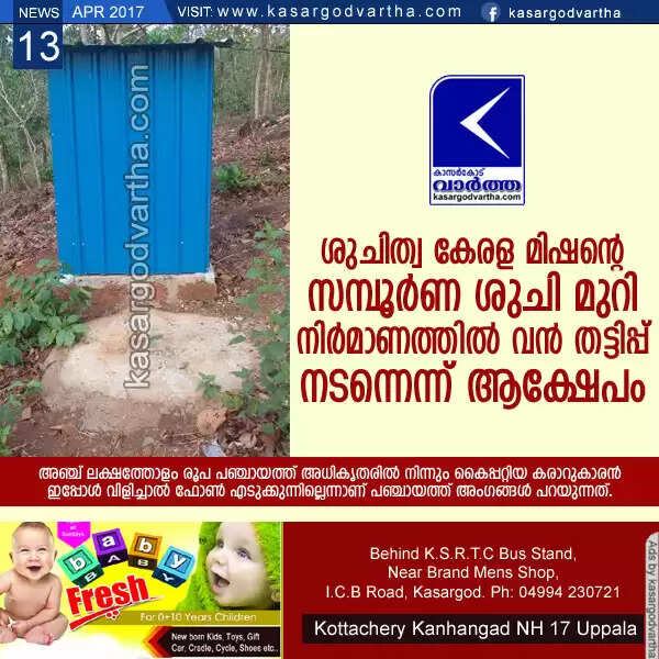 കാസര്‍കോട്: (www.kasargodvartha.com 13/04/2017) ശുചിത്വ കേരള മിഷന്റെ ഭാഗമായി കുറ്റിക്കോല്‍ പഞ്ചായത്തില്‍ നടത്തിയ ശുചി മുറി നിര്‍മാണത്തില്‍ വന്‍ തട്ടിപ്പ് നടന്നതായി ആക്ഷേപമുയര്‍ന്നു. സി പി എം നേതാവായ എന്‍ ടി ലക്ഷ്മി പ്രസിഡന്റായിരുന്ന ഭരണ സമിതി പട്ടികജാതി - പട്ടികവര്‍ഗ വിഭാഗങ്ങള്‍ക്കാവശ്യമായ ശുചി മുറികള്‍ നിര്‍മിക്കാന്‍ വെള്ളരിക്കുണ്ട് സ്വദേശിക്ക് കരാറു നല്‍കിയതാണ് വിവാദമായത്.