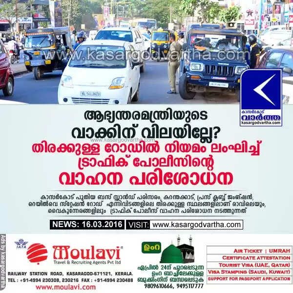 ആഭ്യന്തരമന്ത്രിയുടെ വാക്കിന് വിലയില്ലേ? തിരക്കുള്ള റോഡില് നിയമം ലംഘിച്ച് ട്രാഫിക് പോലീസിന്റെ വാഹന പരിശോധന