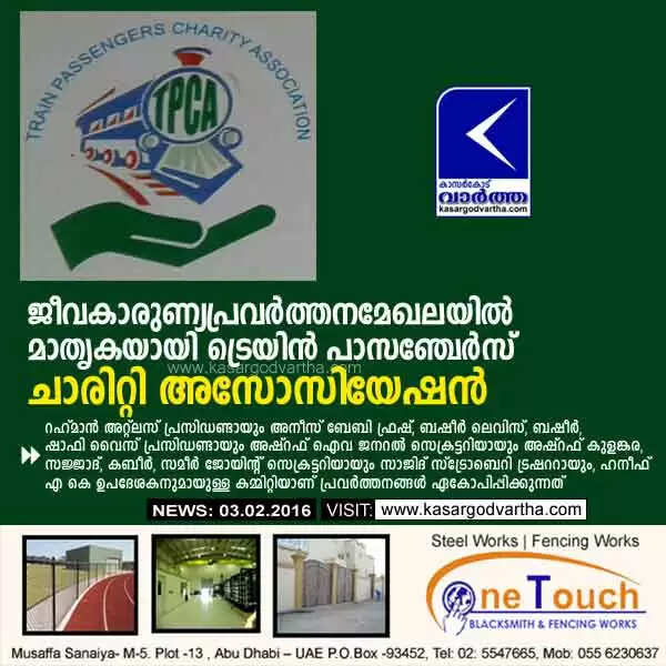 ജീവകാരുണ്യപ്രവര്ത്തനമേഖലയില് മാതൃകയായി ട്രെയിന് പാസഞ്ചേര്സ് ചാരിറ്റി അസോസിയേഷന്