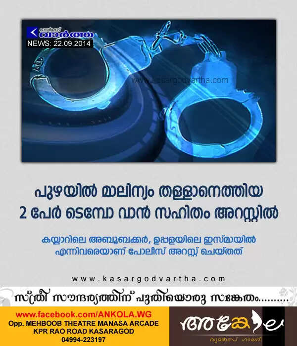 കുമ്പള: (www.kasargodvartha.com 22.09.2014) പുഴയില്‍ മാലിന്യം തള്ളാനെത്തിയ രണ്ട് പേരെ കുമ്പള പോലീസ് ടെമ്പോ വാന്‍ സഹിതം അറസ്റ്റ് ചെയ്തു. കയ്യാറിലെ അബൂബക്കര്‍, ഉപ്പളയിലെ ഇസ്മായില്‍ എന്നിവരെയാണ് പോലീസ് അറസ്റ്റ് ചെയ്തത്. മാലിന്യം തള്ളാന്‍ കൊണ്ടുവന്ന കെ.എല്‍ 14 എന്‍ 1003 നമ്പര്‍ ടെമ്പോ വാനും പോലീസ് കസ്റ്റഡിയിലെടുത്തു.
