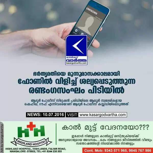ഭര്തൃമതിയെ മൂന്നുമാസക്കാലമായി ഫോണില് വിളിച്ച് ശല്യപ്പെടുത്തുന്ന രണ്ടംഗസംഘം പിടിയില്