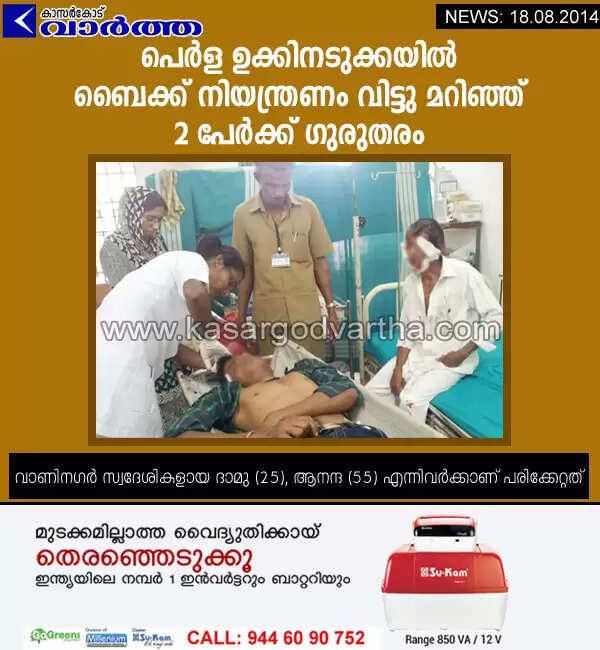 വാണിനഗര് സ്വദേശികളായ ദാമു (25), ആനന്ദ (55) എന്നിവര്ക്കാണ് പരിക്കേറ്റത്. ഇവരെ കാസര്കോട് ജനറല് ആശുപത്രിയില് പ്രവേശിപ്പിച്ചു. കാസര്കോട് ഭാഗത്തേക്കു വരികയായിരുന്ന ബൈക്ക് നിയന്ത്രണം വിട്ട് ഓവുചാലിലേക്ക് മറിയുകയായിരുന്നു. ഓടിക്കൂടിയ നാട്ടുകാരാണ് ഇരുവരേയും ആശുപത്രിയിലെത്തിച്ചത്.