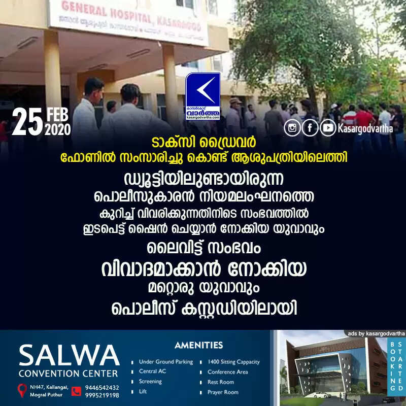 കാസര്‍കോട്: (www.kasargodvartha.com 25.02.2020) ടാക്‌സി ഡ്രൈവര്‍ ഫോണില്‍ സംസാരിച്ചു കൊണ്ട് ആശുപത്രിയിലെത്തിയത് ഡ്യൂട്ടിയിലുണ്ടായിരുന്ന പൊലീസുകാരന്‍ ചോദ്യം ചെയ്യുകയും നിയമലംഘനത്തെ കുറിച്ച് വിവരിക്കുകയും ചെയ്യുന്നതിനിടെ സംഭവത്തില്‍ ഇടപെട്ട് ഷൈന്‍ ചെയ്യാന്‍ നോക്കിയ യുവാവും ലൈവിട്ട് സംഭവം വിവാദമാക്കാന്‍ നോക്കിയ മറ്റൊരു യുവാവും പൊലീസ് കസ്റ്റഡിയിലായി. ചെമ്മനാട്ടെ സുബൈര്‍(36), നായന്മാര്‍മൂലയിലെ മുഹമ്മദ് റമീസ്(26) എന്നിവരാണ് പൊലീസ് കസ്റ്റഡിയിലായത്.