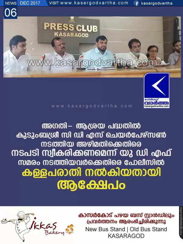 Keywords: News, Kasaragod, Uduma, Kudumbasree, CDS, UDF, CPM, Police, Press meet, Corruption, UDFdemand to take action against the Kudumbashree CDS chairperson,
