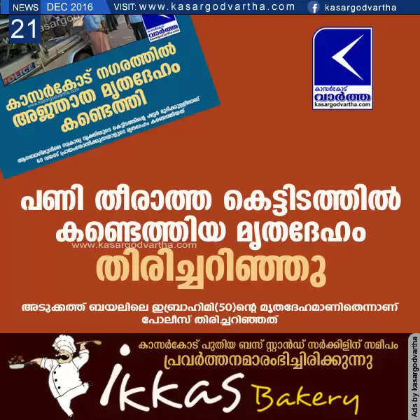 കാസര്കോട്: (www.kasargodvartha.com 21/12/2016) കഴിഞ്ഞ ദിവസം രാവിലെ കാസര്കോട് ആനവാതുക്കലിലെ പണിതീരാത്ത കെട്ടിടത്തിനകത്ത് കണ്ടെത്തിയ മൃതദേഹം തിരിച്ചറിഞ്ഞു. അടുക്കത്ത്ബയലിലെ ഇബ്രാഹിമി(50)ന്റെ മൃതദേഹമാണിതെന്നാണ് പോലീസ് തിരിച്ചറിഞ്ഞത്. ഇബ്രാഹിമിനെ മാസങ്ങള്ക്ക് മുമ്പുതന്നെ കാണാതായിരുന്നു.