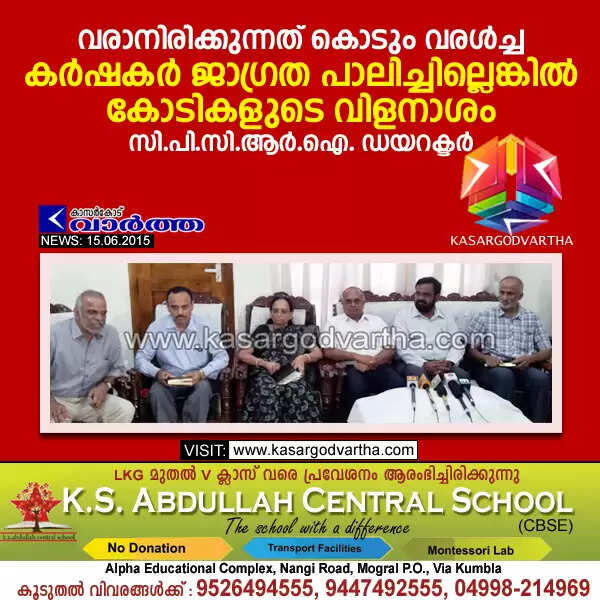 കാസര്‍കോട്: (www.kasargodvartha.com 15/06/2015) രാജ്യത്ത് വരാനിരിക്കുന്നത് കൊടും വരള്‍ച്ചയാണെന്നും കര്‍ഷകര്‍ ജാഗ്രത പലിച്ചില്ലെങ്കില്‍ കോടികളുടെ വിളനാശം സംഭവിക്കുമെന്നും സി.പി.സി.ആര്‍.ഐ. ഡയറക്ടര്‍ ഡോ. ചൗഡപ്പ വാര്‍ത്താ സമ്മേളനത്തില്‍ അറിയിച്ചു. രാജ്യത്ത് കാലവര്‍ഷം സംബന്ധിച്ച സ്ഥിതിഗതികള്‍ നിരീക്ഷിച്ചുകൊണ്ട് കേന്ദ്രസര്‍ക്കാര്‍ എല്ലാ കാര്‍ഷിക ഗവേഷണ കേന്ദ്രങ്ങള്‍ക്കും മറ്റു സ്ഥാപനങ്ങള്‍ക്കും ജാഗ്രതാ നിര്‍ദേശം നല്‍കിയിട്ടുണ്ട്. ഈ സാഹചര്യത്തില്‍ വിളനാശം ഒഴിവാക്കാന്‍ എന്തെല്ലാം നടപടി സ്വീകരിക്കണമെന്നകാര്യം ഡയറക്ടര്‍ വിശദീകരിച്ചു.