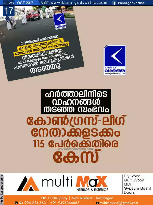ഹര്ത്താലിനിടെ വാഹനങ്ങള് തടഞ്ഞ സംഭവം; കോണ്ഗ്രസ് -ലീഗ് നേതാക്കളടക്കം 115 പേര്ക്കെതിരെ കേസ്