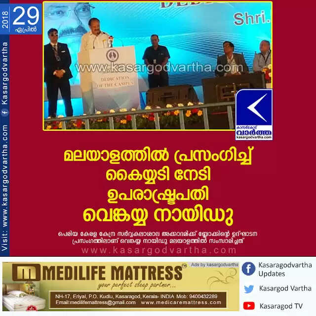 Keywords: News, Periya, Kasaragod, Kerala, Students, Venkaiah Naidu,Vice President Speak in Malayalam at CUK