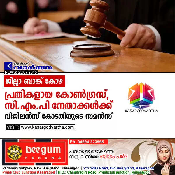 കാസര്‍കോട്: (www.kasargodvartha.com 23/07/2015) പ്രമാദമായ ജില്ലാ ബാങ്ക് കോഴക്കേസില്‍ പ്രതികളായ കോണ്‍ഗ്രസ്, സി.എം.പി നേതാക്കള്‍ക്ക് വിജിലന്‍സ് കോടതി സമന്‍സ് അയച്ചു. വെള്ളിയാഴ്ച കോഴിക്കോട് വിജിലന്‍സ് കോടതിയില്‍ ഹാജരാകാനാണ് സമന്‍സ്.