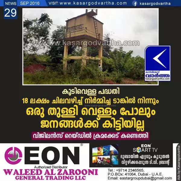 കുടിവെള്ള പദ്ധതി; 18 ലക്ഷം ചിലവഴിച്ച് നിര്‍മ്മിച്ച ടാങ്കില്‍ നിന്നും ഒരു തുള്ളി വെള്ളം പോലും ജനങ്ങള്‍ക്ക് കിട്ടിയില്ല, വിജിലന്‍സ് റെയ്ഡില്‍ ക്രമക്കേട് കണ്ടെത്തി