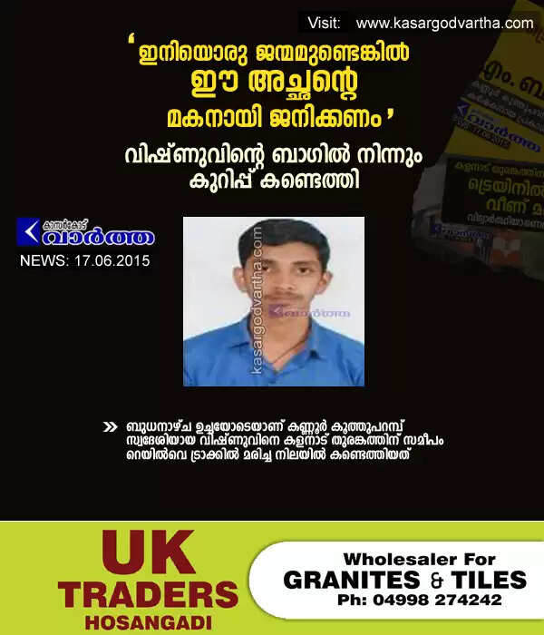 കാസര്കോട്: (www.kasargodvartha.com 17/06/2015) കളനാട് തുരങ്കത്തിന് സമീപം റെയില്വെ ട്രാക്കില് മരിച്ച നിലയില് കണ്ടെത്തിയ കണ്ണൂര് കൂത്തുപറമ്പ് സ്വദേശിയും എം.ബി.ബി.എസ് വിദ്യാര്ത്ഥിയുമായ വിഷ്ണു (20) വിന്റെ ബാഗില് നിന്നും കുറിപ്പ് കണ്ടെത്തി. ഇനിയൊരു ജന്മമുണ്ടെങ്കില് ഈ അച്ഛന്റെ മകനായി ജനിക്കണം എന്ന് പറഞ്ഞാണ് കത്ത് തുടങ്ങുന്നത്.
