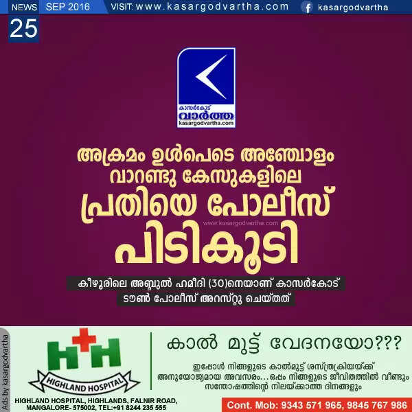 Keywords: Kasaragod, Kerala, Attack, Assault, Police, case, Accuse, arrest, Warrant case accused arrested, Kizhur, Youth, Kasaragod Town police.