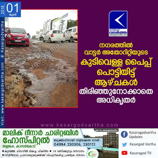 Keywords: Kasaragod, Kerala, news, Road, Water authority, Drinking water, Water authority pipe damaged in M.G Road