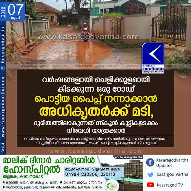 കാസര്കോട്: (www.kasargodvartha.com 07.06.2018) വര്ഷങ്ങളായി ചെളിക്കുളമായി കിടക്കുകയാണ് കാസര്കോട് മെഡോണ എല് പി സ്കൂളിന് സമീപത്തെ റോഡ്. വാട്ടര് അതോറിറ്റിയുടെ പൈപ്പ് പൊട്ടിയിട്ട് വര്ഷമായിട്ടും ഇതുവരെ നന്നാക്കാന് അധികൃതര് തയ്യാറായിട്ടില്ല. ഇതോടെ ഈ വഴിയിലൂടെ യാത്ര ചെയ്യുന്ന സ്കൂള് കുട്ടികളടക്കം നിരവധി യാത്രക്കാര് ദുരിതത്തിലായിരിക്കുകയാണ്.