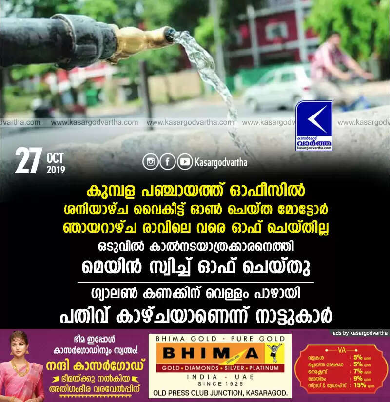 കുമ്പള പഞ്ചായത്ത് ഓഫീസില് ശനിയാഴ്ച വൈകീട്ട് ഓണ് ചെയ്ത മോട്ടോര് ഞായറാഴ്ച രാവിലെ വരെ ഓഫ് ചെയ്തില്ല, ഒടുവില് കാല്നടയാത്രക്കാരനെത്തി മെയിന് സ്വിച്ച് ഓഫ് ചെയ്തു; ഗ്യാലണ് കണക്കിന് വെള്ളം പാഴായി, പതിവ് കാഴ്ചയാണെന്ന് നാട്ടുകാര്