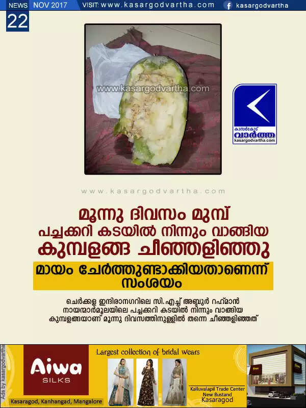 കാസര്‍കോട്: (www.kasargodvartha.com 22.11.2017) മൂന്നു ദിവസം മുമ്പ് പച്ചക്കറി കടയില്‍ നിന്നും വാങ്ങിയ കുമ്പളങ്ങ ചീഞ്ഞളിഞ്ഞതായി പരാതി. ചെര്‍ക്കള ഇന്ദിരാനഗറിലെ സി.എച്ച് അബ്ദുര്‍ റഹ് മാന്‍ നായന്മാര്‍മൂലയിലെ പച്ചക്കറി കടയില്‍ നിന്നും വാങ്ങിയ കുമ്പളങ്ങയാണ് മൂന്നു ദിവസത്തിനുള്ളില്‍തന്നെ ചീഞ്ഞളിഞ്ഞത്. സാധാരണഗതിയില്‍ ഒരു കുമ്പളങ്ങ അതേനിലയില്‍ ഒരു മാസവും അതില്‍കൂടുതലും സൂക്ഷിക്കാന്‍ കഴിയും.