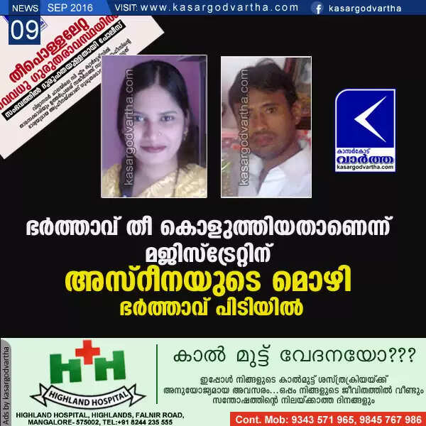 ഭര്ത്താവ് തീ കൊളുത്തിയതാണെന്ന് മജിസ്ട്രേറ്റിന് അസ്റീനയുടെ മൊഴി; ഭര്ത്താവ് പിടിയില്