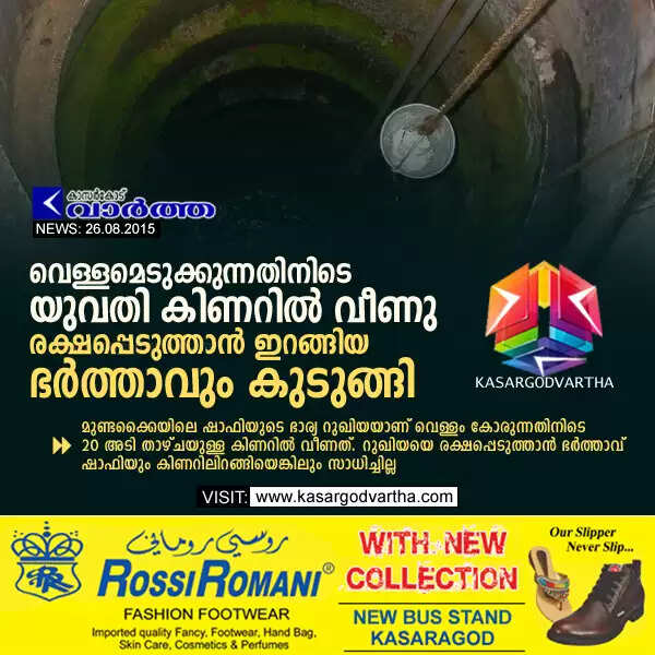 മുണ്ടക്കൈയിലെ ഷാഫിയുടെ ഭാര്യ റുഖിയ (36)യാണ് വെള്ളം കോരുന്നതിനിടെ 20 അടി താഴ്ചയുള്ള കിണറില്‍ വീണത്. റുഖിയയെ രക്ഷപ്പെടുത്താന്‍ ഭര്‍ത്താവ് ഷാഫിയും കിണറിലിറങ്ങിയെങ്കിലും സാധിച്ചില്ല. ഇതേതുടര്‍ന്ന് വീട്ടുകാര്‍ കാസര്‍കോട് ഫയര്‍ സ്റ്റേഷനില്‍ വിവരം അറിയിക്കുയായിരുന്നു. അഡീ. സ്റ്റേഷന്‍ ഓഫീസര്‍ ടി.വി അശോകന്റെ നേതൃത്വത്തിലെത്തിയ അഗ്നിശമന സേനാംഗങ്ങള്‍ കിണറിലിറങ്ങുകയും ദമ്പതികളെ കരക്കെത്തിക്കുകയുമായിരുന്നു.