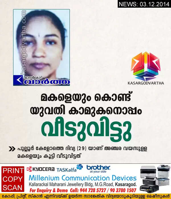 കാഞ്ഞങ്ങാട്: (www.kasargodvartha.com 03.12.2014) മകളെയും കൊണ്ട് യുവതി അര്ധരാത്രി കാമുകനൊപ്പം വീടുവിട്ടു. പുല്ലൂര് കേളോത്തെ കെ.പി ബാലന്റെ മകള് ദിവ്യ (29) യാണ് അഞ്ചര വയസുള്ള മകളെയും കൂട്ടി വീടുവിട്ടത്.