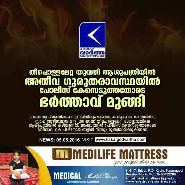 കാഞ്ഞങ്ങാട്: (www.kasargodvartha.com 05.05.2016) തീപൊള്ളലേറ്റ് ആശുപത്രിയില്‍ കഴിയുന്ന നേഴ്‌സിന്റെ നില അതീവ ഗുരുതരമായി തുടരുന്നു. കാഞ്ഞങ്ങാട് ആവിക്കര സ്വദേശിനിയും മഞ്ചേശ്വരം ആരോഗ്യ കേന്ദ്രത്തിലെ സ്റ്റാഫ് നേഴ്‌സുമായ രന്യ (28) യാണ് തീപൊള്ളലേറ്റ് മംഗളൂരുവിലെ ആശുപത്രിയില്‍ കഴിയുന്നത്. മീഞ്ച പഞ്ചായത്തിലെ ജൂനിയര്‍ ഹെല്‍ത്ത് ഇന്‍സ്‌പെക്ടര്‍ കെ പി മനോജിന്റെ ഭാര്യയാണ് രന്യ.