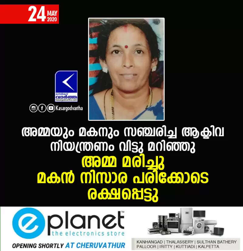 അമ്മയും മകനും സഞ്ചരിച്ച ആക്ടിവ നിയന്ത്രണം വിട്ടു മറിഞ്ഞു; അമ്മ മരിച്ചു, മകന്‍ നിസാര പരിക്കോടെ രക്ഷപ്പെട്ടു