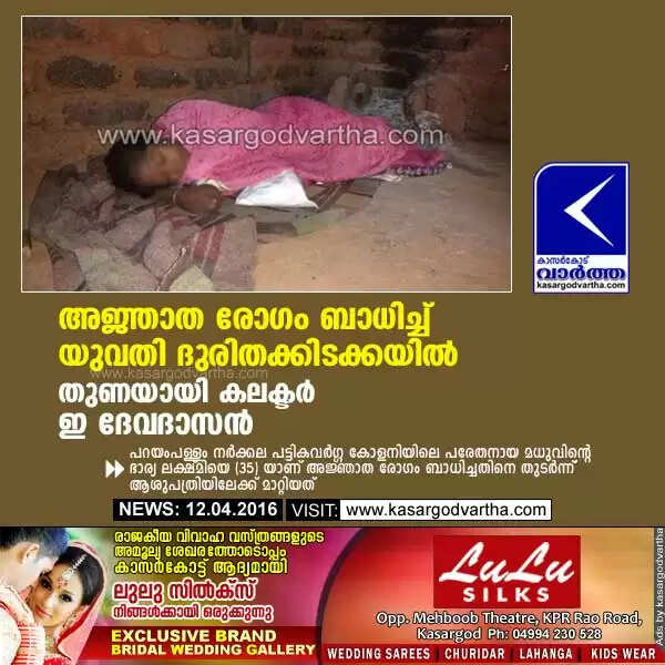 കാസര്‍കോട്: (www.kasargodvartha.com 12/04/2016) പള്ളത്തിങ്കാലില്‍ അജ്ഞാതരോഗം ബാധിച്ച് ഗുരുതരാവസ്ഥയില്‍ കഴിയുന്ന യുവതിയെ കാസര്‍കോട് ജില്ലാ കളക്ടര്‍ ഇ ദേവദാസിന്റെ നിര്‍ദ്ദേശാനുസരണം ആശുപത്രിയിലേക്ക് മാറ്റി. പറയംപള്ളം നര്‍ക്കല പട്ടികവര്‍ഗ്ഗ കോളനിയിലെ പരേതനായ മധുവിന്റെ ഭാര്യ ലക്ഷ്മിയെ (35) യാണ് അജ്ഞാത രോഗം ബാധിച്ചതിനെ തുടര്‍ന്ന് ആശുപത്രിയിലേക്ക് മാ്റ്റിയത്. വിഷു പ്രമാണിച്ച്  ഇവര്‍ക്ക് ഭക്ഷ്യ വസ്തുക്കള്‍ നല്‍കുന്നതിന് കുറ്റിക്കോല്‍ എയുപിഎസ് അധ്യാപകനും സാമൂഹ്യപ്രവര്‍ത്തകനുമായ കെ ആര്‍ സാനുവിന്റ നേതൃത്വത്തിലുള്ള സംഘം ലക്ഷ്മിയുടെ വീട്ടിലെത്തിപ്പോള്‍ അടുപ്പിനടുത്ത് നിലത്ത് അബോധാവസ്ഥയില്‍ കിടക്കുന്ന നിലയില്‍ ലക്ഷ്മിയെ കണ്ടെത്തുകയായിരുന്നു.